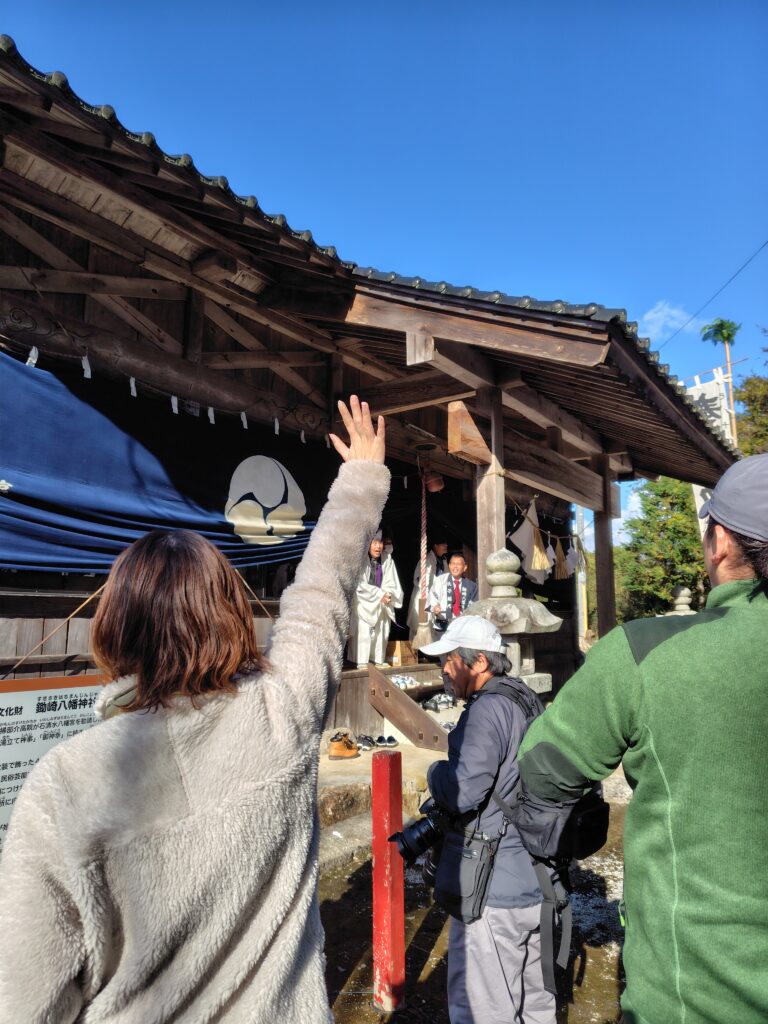 そして、他方面から来たグループと合流し、更に大きな団体となって八幡宮へ上がります。八幡宮の境内で更に跳び(これが長いっ!)社殿にてやっと昼食。朝同様、皆で桶を囲み🍺🍶🤩🍺🍶🤩🍶🍺💞 狭い社殿でひしめき合って皆でワイワイと😋これぞ、THE 村の祭りという感じ🤩
