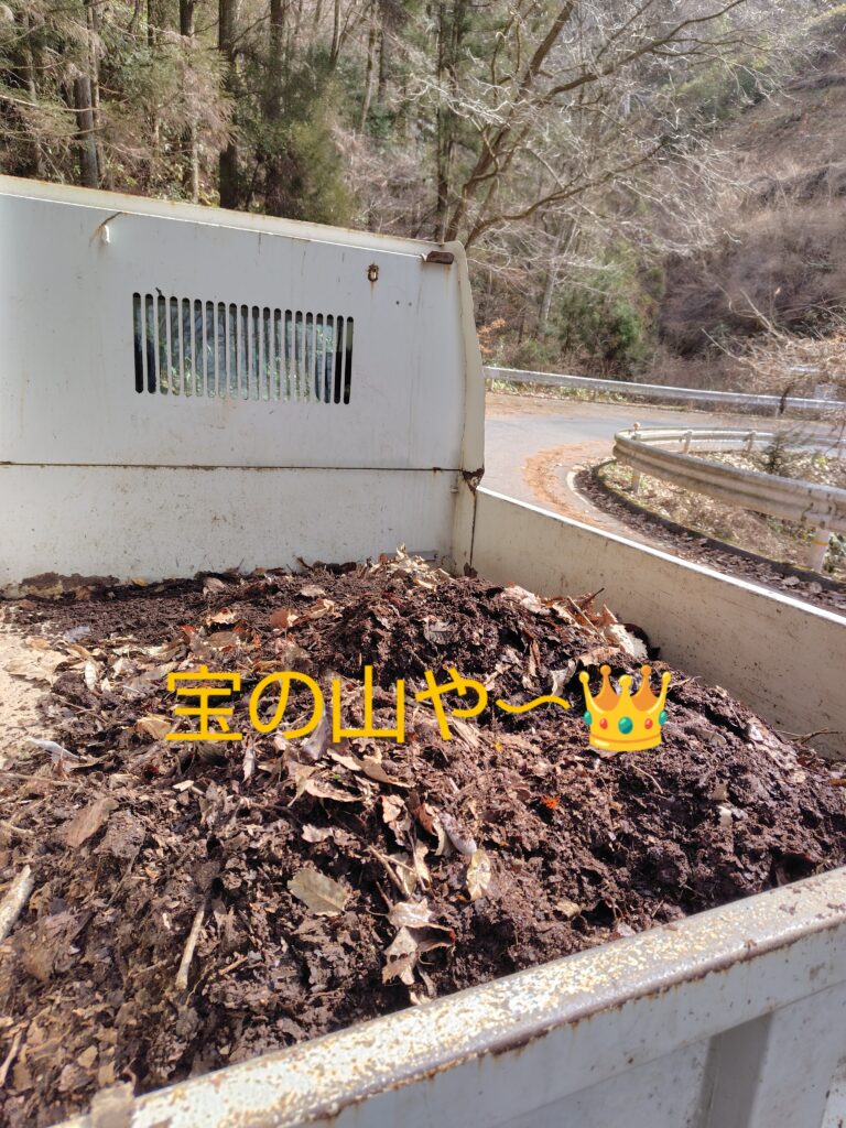 同じ場所に毎年落ち葉が堆積し、いつの間にか出来てしまった堆肥も2棟分取れました!「宝(堆肥)の宝庫や〰️👑取り放題や〰️😍」と喜ぶ夫君。